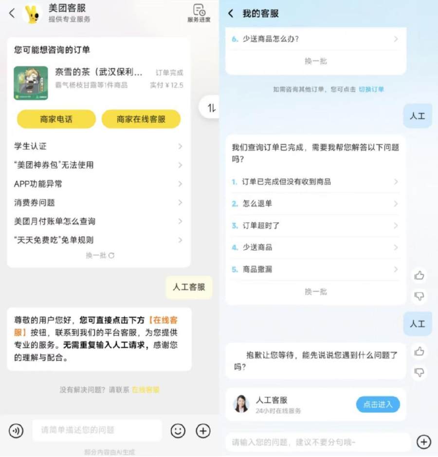 而在售后环节,三个平台的智能客服会列出“猜您想问”的几个问题,选择“已收到餐,但少送餐品”后,给出“我要退款”或“我要补送”两个选择。