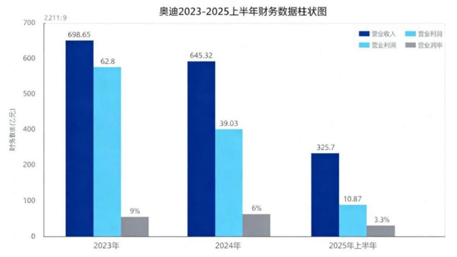 奥迪2023-2025上半年,营业收入、营业利润、营业利润率均持续下滑,2025上半年营业利润率仅3.3%,业绩呈明显衰退态势。