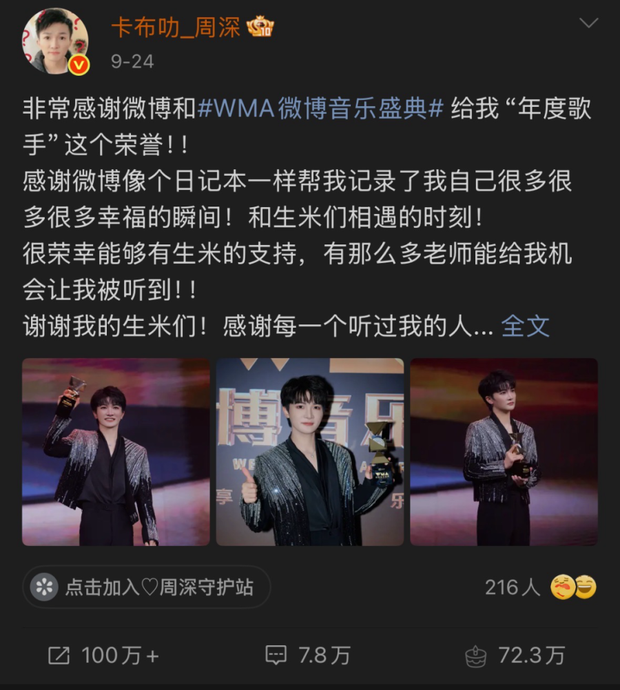 越来越多音乐类盛典的出现,恰好印证了这一行业逻辑。以微博音乐盛典为例,落幕当晚李宇春、周深等数十位艺人同步发文,“感谢音乐把我们聚在一起” 的表述里满是对音乐联结价值的认可,相关互动量突破百万。