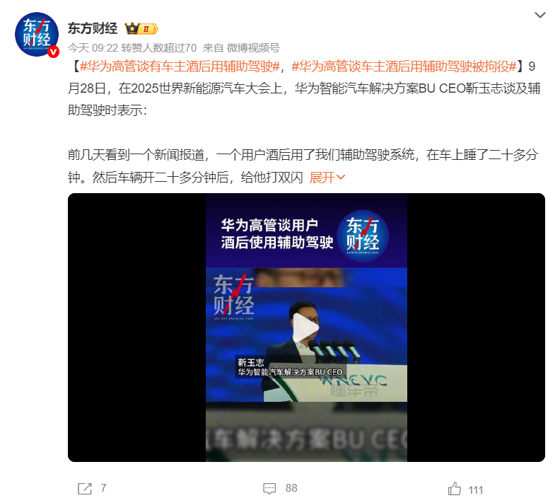 据媒体报道,9月28日,在2025世界新能源汽车大会上,华为智能汽车解决方案BU CEO靳玉志谈及辅助驾驶时表示:“前几天看到一个新闻报道,一个用户酒后用了我们辅助驾驶系统,在车上睡了二十多分钟。然后车辆开二十多分钟后,给他打双闪停到了路边。路人报警后,用户被拘役了一个月15天,外加4000元罚款。