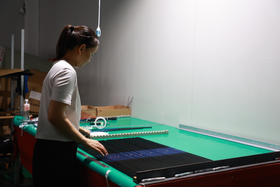 ▲钓具生产的大部分环节仍为手工完成,工人正在对竿节进行质检。