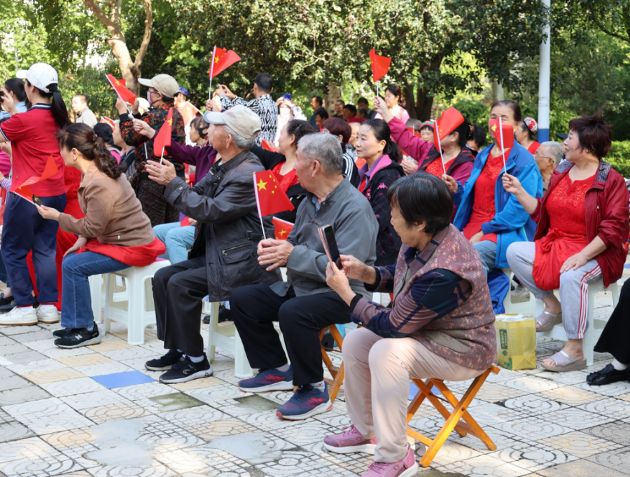 “一看到居民群通知,我马上赶往广场,远远就看见一片中国红在风中飘扬。”9月30日下午,上街区中心路街道鸿园社区广场上座无虚席,居民们手中的小红旗随风舞动,像撒了一地的星星火种。