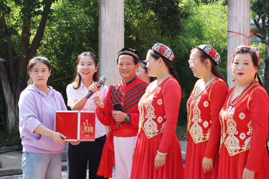 最让人期待的当属抽奖环节!主持人刚拿起号码牌,全场瞬间安静。“15号!”张阿姨“腾”地起身,挥舞着号码纸和红旗冲上台:“是我!可算中了!”她接过礼品时眼角弯成了月牙。随后中奖的李叔也攥着红旗上台,开心地说:“拿着红旗领奖,这国庆过得真有滋味!”