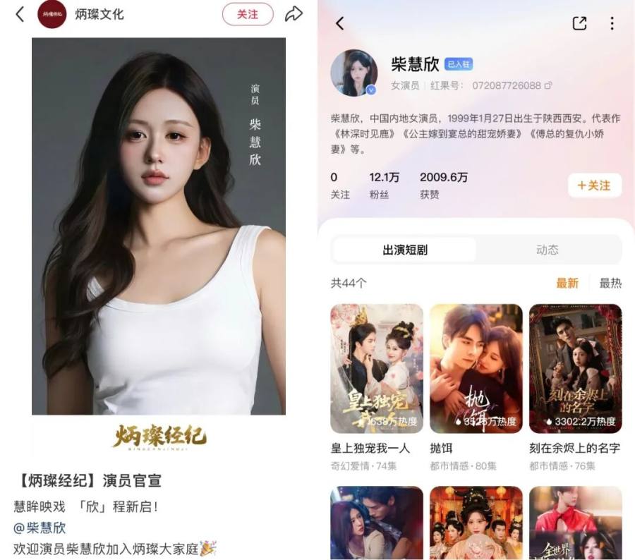就在今年,黄晓明也入局短剧经纪业务,成立了公司“炳璨文化”,从8月到现在,这家公司已签下5个新人演员,其中最火的柴慧欣,红果粉丝数也仅有12w。