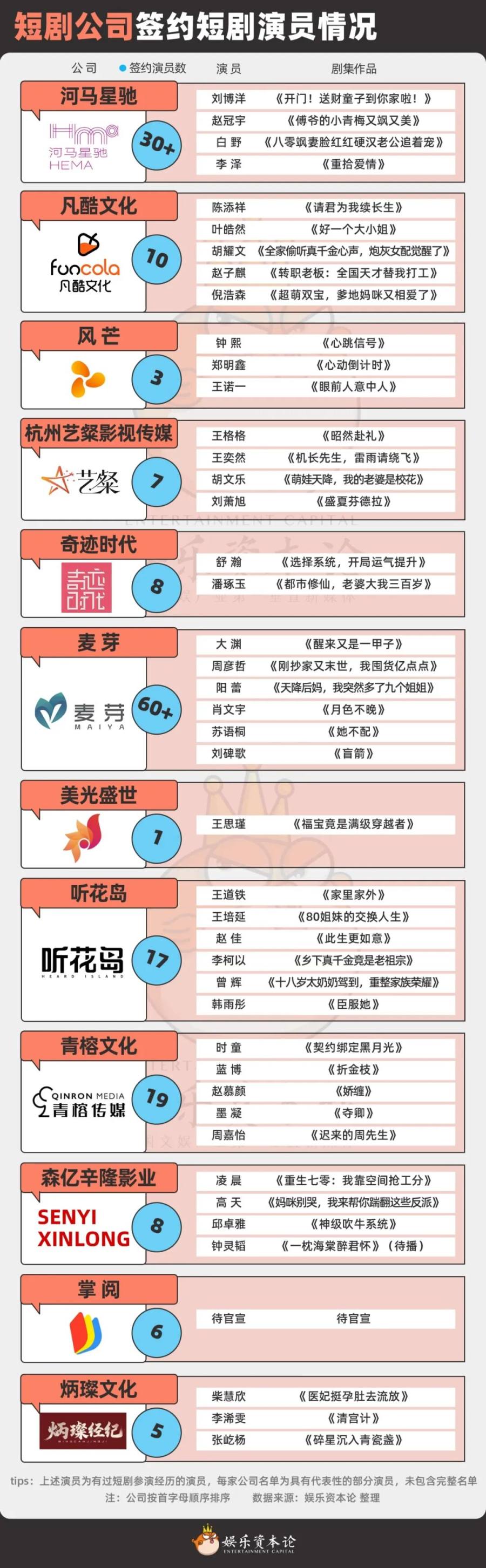 横店的星探比演员还忙,蹲在片场门口递名片,就为抢刚露脸的新人。各家经纪部门也各显神通:欢瑞的 “新生计划”收到24000份新人简历,签下100多人,将新人们纷纷投入短剧中”以演代练“;点众旗下的河马星驰,从合作演员里签人,要争取在Q4实现签约演员覆盖公司剧集主演……