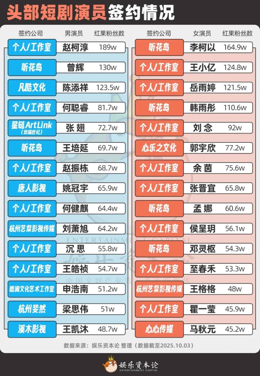 听花岛签约的17人中,6个演员红果粉丝量在50w以上,《十八岁太奶》系列主演李柯以、曾辉在红果平台分别拥160w+、127w+粉丝。与马厩制片厂深度绑定的艺粲影视传媒旗下有王格格、刘萧旭,刘萧旭最近因《盛夏芬德拉》大火,持续霸榜红果男演员热度TOP1。