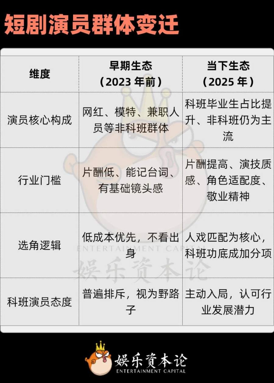 这种转变的背后,是短剧演员生态最鲜明的迭代,曾经 “非科班扎堆、科班瞧不上” 的格局,正被彻底改写。