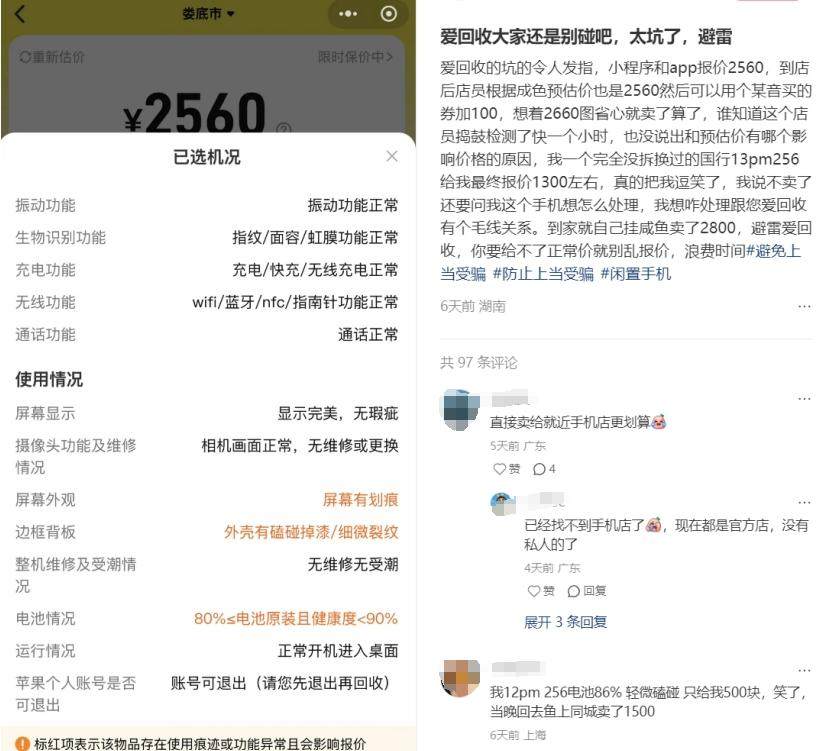 最集中的争议,围绕在爱回收估价的“两套标准”——线上预估价看似诚意十足,线下验机却频繁“反转”。