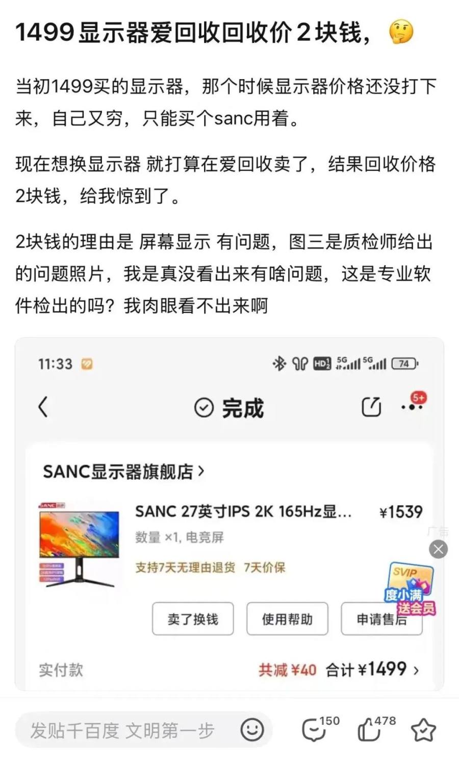 “趣解商业”注意到,在贴吧、知乎等平台上有大量相似案例:旧的手机、扫地机器人、显示器等,爱回收最终回收价仅为2元。