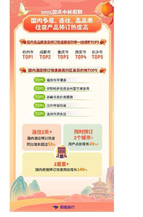 今年国庆中秋假期,国内住宿市场呈现出连住酒店订单增速快、跨城市酒店预订频次高、非一线城市高品质酒店和多居室民宿预订热度高的特征。同程旅行数据显示,今年国庆中秋假期,国内酒店整体预订热度同比增长超过65%,连住2天及以上的国内酒店预订热度同比增长超过52%。