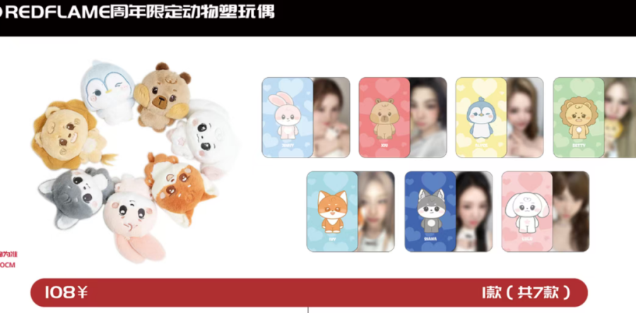 团队发现,粉丝们会对每个成员进行“动物塑”。主唱胡静怡被粉丝看作是一只兔子,周洛汐的动物塑是企鹅,刘秀婷的形象是卡皮巴拉。R.E.D女团决定把这种“动物塑”的点子做成毛绒公仔。公仔的设计既要符合动物原本的颜色,也要尽量贴合艺人本人。这些公仔作为R.E.D女团一周年演唱会限定周边,上线后就迅速售罄。