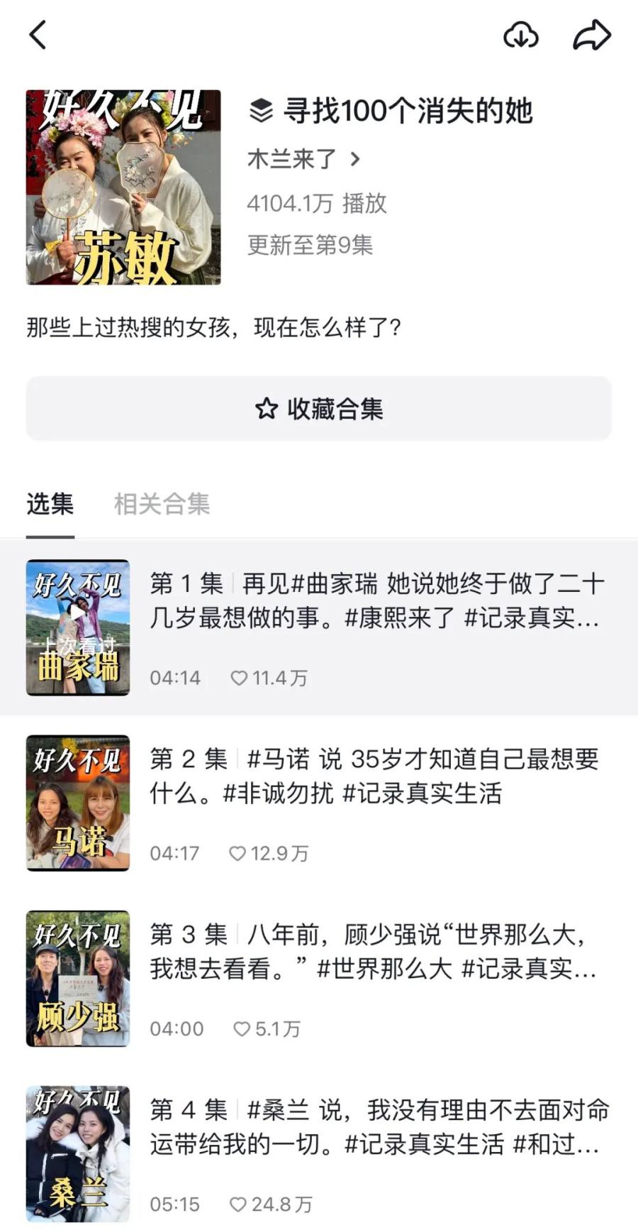 无奈之下,木兰将这个纪录片项目的成本从一期50万降到了5000元,拍完在抖音播放,但没想到获得了超预期的反馈,这就是已有超4000万播放的《那些上过热搜的女孩,现在怎么样了?》。该系列记录了“人生大女主”曲家瑞、五十岁离家出走开启新人生的苏敏、写下“世界那么大,我想去看看”的顾少强、说出“我还是坐在宝马车上哭”的女嘉宾马诺等很多曾在互联网上掀起过讨论和争议的女性。