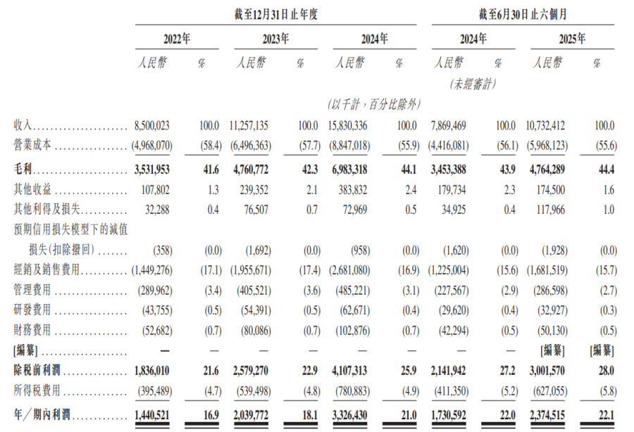 作为深圳市老字号饮料生产企业,近几年,东鹏饮料业绩增长迅速,2022年-2025年上半年,东鹏饮料的收入分别约为85亿元、112.57亿元、158.3亿元、107.32亿元;毛利分别约为35.32亿元、47.61亿元、69.83亿元、47.64亿元;净利润分别约为14.41亿元、20.4亿元、33.26亿元、23.75亿元。