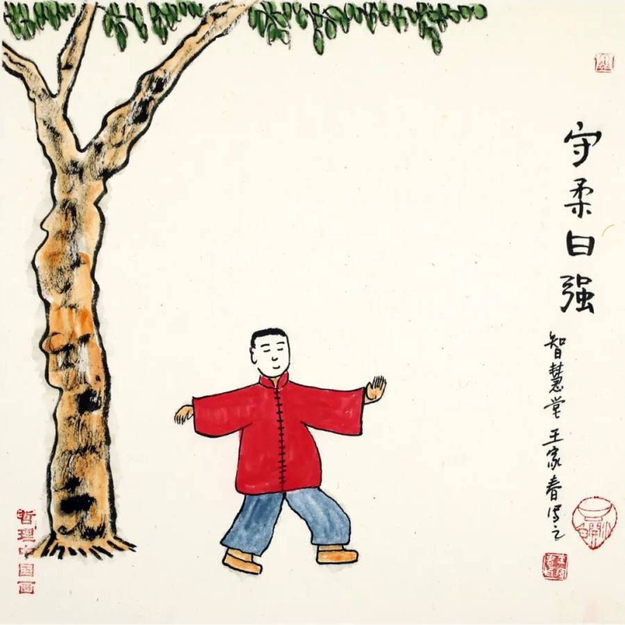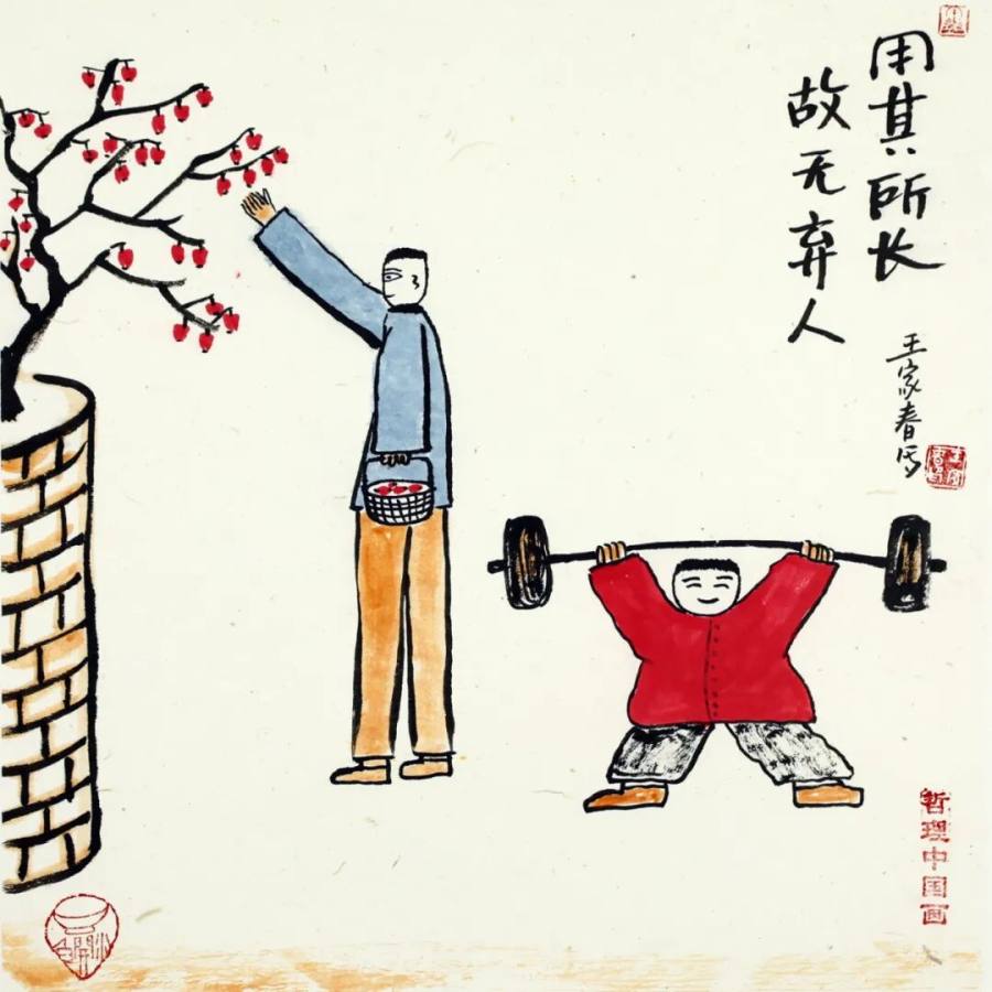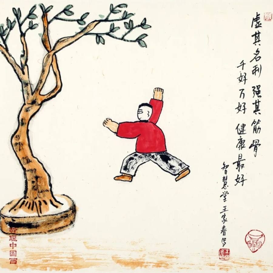 在题材选择上,王家春延续了文人画从经典中汲取养分的特质,却更注重与当代生活的连接,尤其贴合现代人的心理需求。《生命在于运动》以夸张肢体语言描绘晨练者,流动衣纹演绎"流水不腐"的养生智慧,既是对健康生活的倡导,也暗喻通过行动消解压力的积极态度;《一屋不扫何以扫天下》通过执帚者日常场景,将儒家"修身齐家"命题落于生活实处,在琐碎日常中提炼出"从当下做起"的治愈力量。与丰子恺作品中对民国生活的诗意捕捉不同,王家春避开说教式灌输,通过意境营造引发观者主动思考,让抽象哲理在当代语境中转化为可感知的心理慰藉,实现了传统智慧的现代表达。