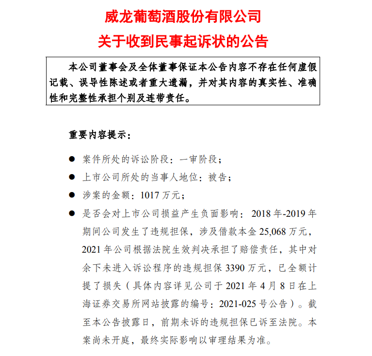 10月9日,威龙葡萄酒股份有限公司(下称“威龙股份”)发布公告显示,公司近日收到烟台市芝罘区人民法院送达的《民事起诉状》、《开庭传票》等法律文书,因一起担保纠纷被诉至法院,原告要求公司就一笔历史债务承担1017万元的补充赔偿责任。