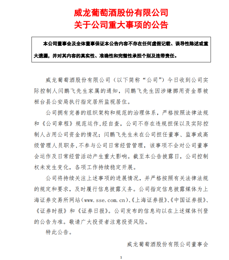 不过,威龙股份在公告中表示,经自查,公司不存在违规担保以及实际控制人占用公司资金的情况;闫鹏飞未在公司担任董事、监事或高级管理人员职务,不参与公司日常经营管理,该事项不会对公司董事会运作及日常经营活动产生重大影响。