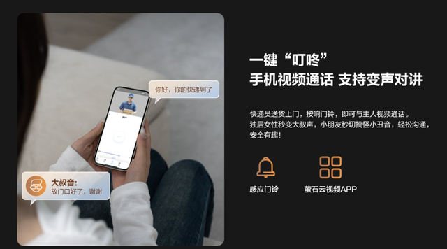 据统计,中国单身成年人口已超2.4亿,其中独居女性比例逐年上升。她们享受独立生活的同时,也面临着更高的安全风险。传统猫眼需要贴近门洞才能看清门外,既不方便也不安全。萤石通过上下双摄像头带来的超广角视野,让用户在室内就能通过高清屏幕将门外情况尽收眼底。更巧妙的是,AI语音交互功能支持切换为低沉的大叔嗓音或滑稽的小丑音,让独居女性可以沉着地对外卖员说“请放在门口”,既保障隐私又提升安全感。