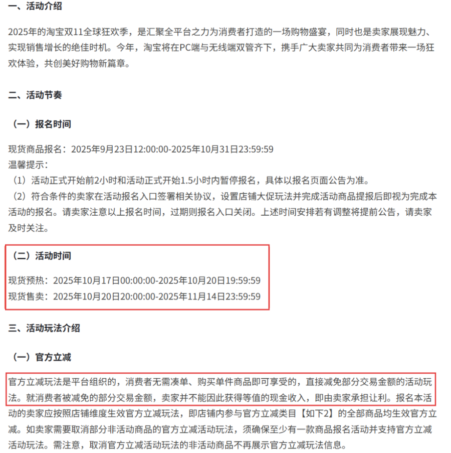 淘宝、天猫的调整力度更为突出,取消了以往多轮预售与现货的复杂模式,将核心玩法聚焦为“官方立减”,即消费者无需凑单,购买单件商品即可享受直接减免部分交易金额。
