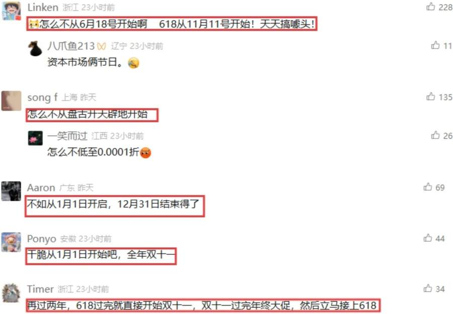 “怎么不从6月18日开始,618从11月11日开始!天天搞噱头!”“怎么不从盘古开天辟地开始。”