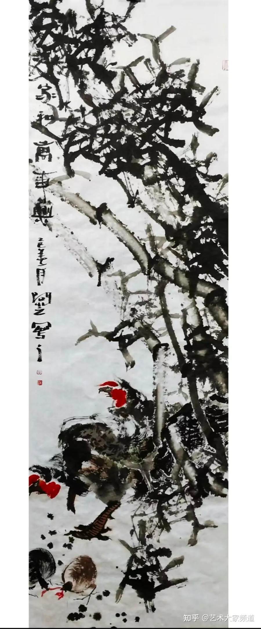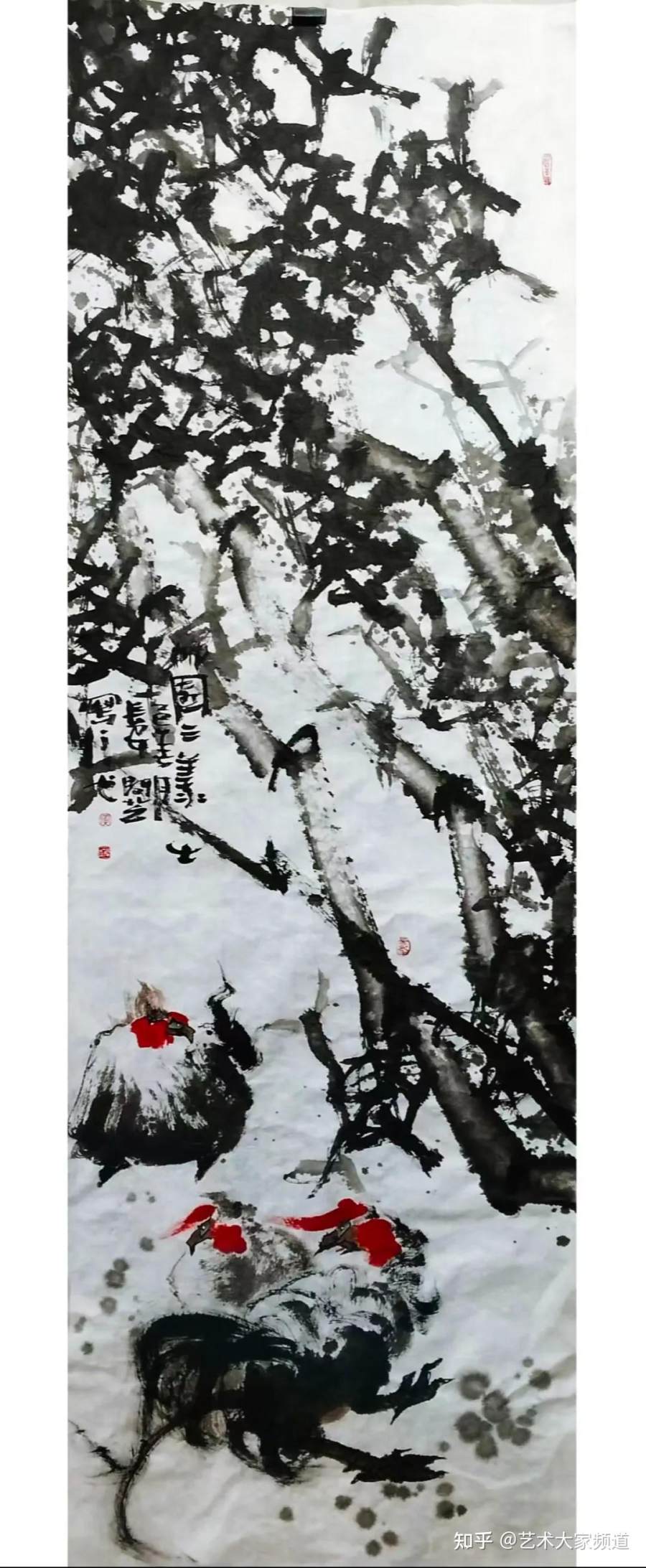 更妙者,先生于竹间点染禽鸟,顿使满幅生机盎然。或有雀鸟三五,羽色朱褐,神态灵动,于竹枝间嬉戏、于竹叶下穿梭,一静一动,一墨一彩,相映成趣。那雀鸟的眼神、翅羽的纹理,皆以极简之笔写出,却形神毕肖,真可谓“以形写神,形神兼备”。又有鸡群数只,红冠黑羽,或昂首阔步,或俯身啄食,其态憨然,其神可掬,于墨竹的清寂中添了几分烟火气,于文人画的雅致里融了些许世俗情,此乃先生独运之匠心也。