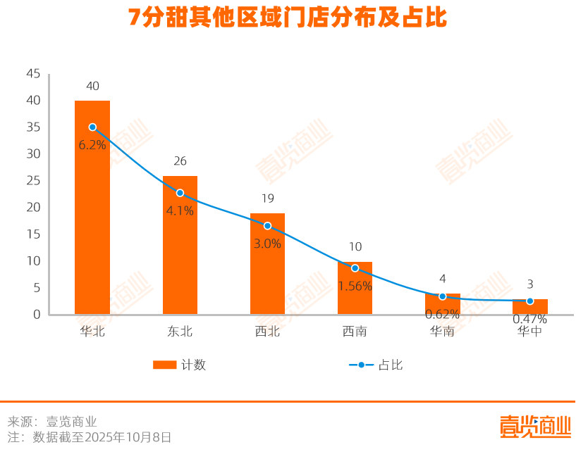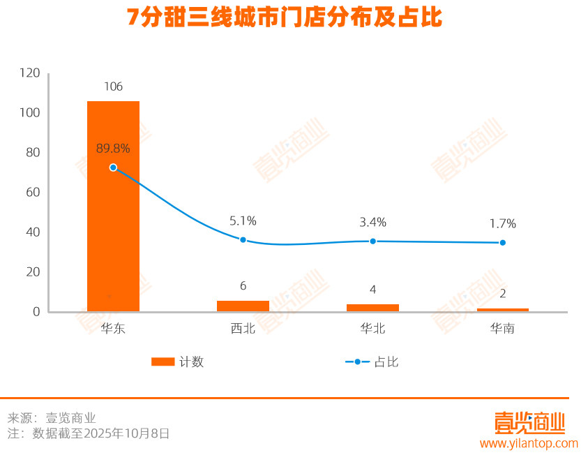 综合来看,7分甜目前仍为高度依赖华东市场的区域品牌,全国化进程尚处于起步阶段。其在华东以外区域门店稀疏,高线城市覆盖不全,下沉节奏缓慢,特殊点位布局薄弱,尚未形成系统化的全国拓展能力。