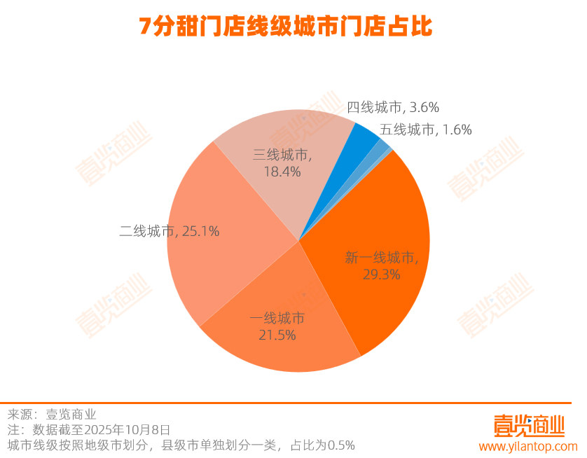 对比2025年8月,7分甜在下沉市场已出现初步拓展信号,但节奏仍偏缓。今年9月,7分甜的二线城市门店数达161家,占比25.1%,较8月提升0.7个百分点;三线及以下城市合计占比约24.1%,仍处低位。
