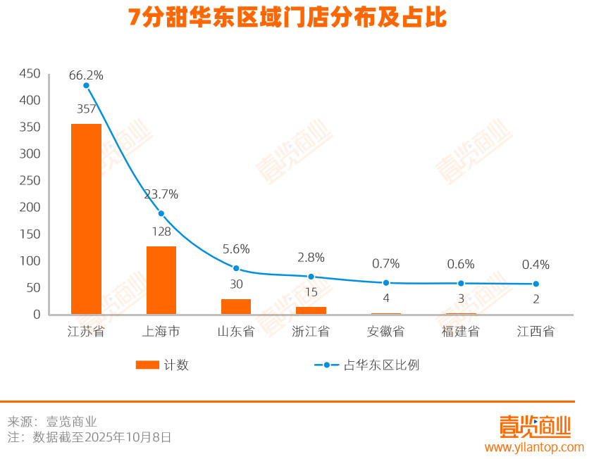 从门店分布上看,华东区域依旧是7分甜的大本营。