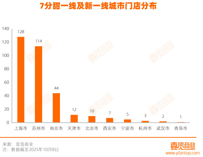 然而,7分甜尚未完成对新一线城市的全覆盖。全国15座新一线城市中,品牌仅进入8座,成都、重庆、长沙、沈阳等高潜力城市仍为空白。即便在已进入的城市中,除苏州、南京外,其余城市门店数普遍不足10家,未形成规模效应。