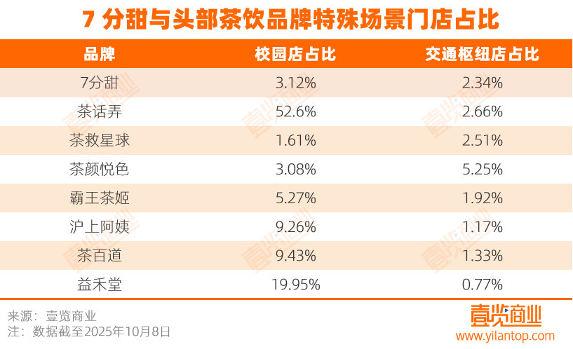 然而现实是,7分甜的校园店主要集中在少数几个城市,对于区域内其他教育重镇如杭州的覆盖明显不足。在交通枢纽场景,品牌整体规模有限,特别是在高铁站这一重要枢纽类型上的缺失,直接限制了品牌在商旅人群中的渗透能力。