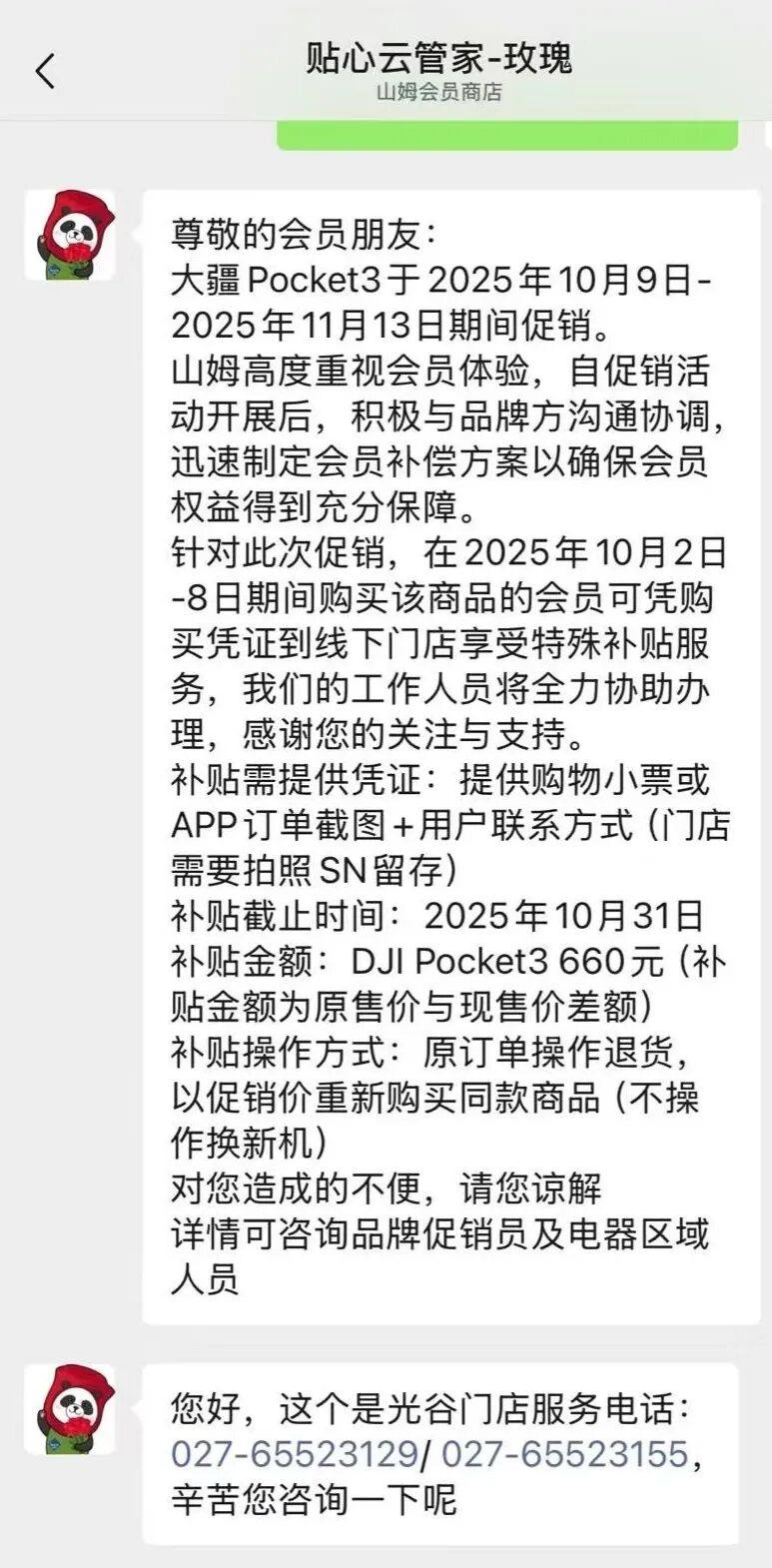 剁椒观察到,有在山姆购买Pocket3的用户维权成功,她用“经过不懈努力”的字样形容自己的维权过程,最终的结果是山姆赔付了等额的优惠券码。随着舆论发酵,部分山姆门店做了进一步的措施:限定时间内的消费者凭证可以补差价。
