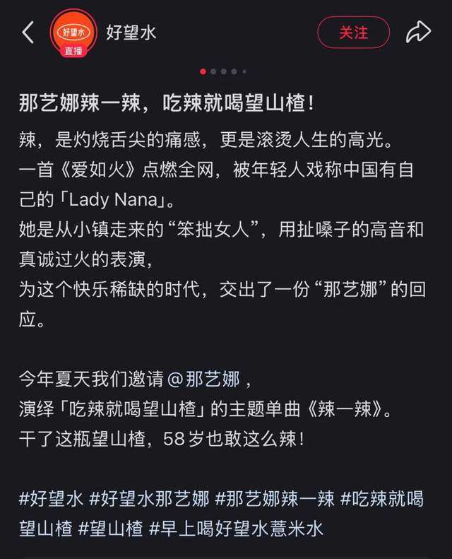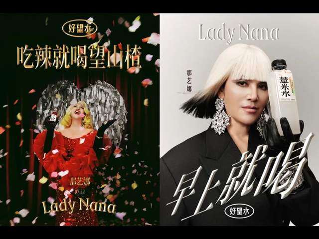 好望水不仅拿下她的首支商业广告,还精心设计了一套消解方案,用“国际巨星感大片”重构形象,直播冠名为“线上演唱会”,海报文案称她为“Lady Nana”“帝国最娇艳的玫瑰”,这次联动让好望水直播间涌进了24万人;