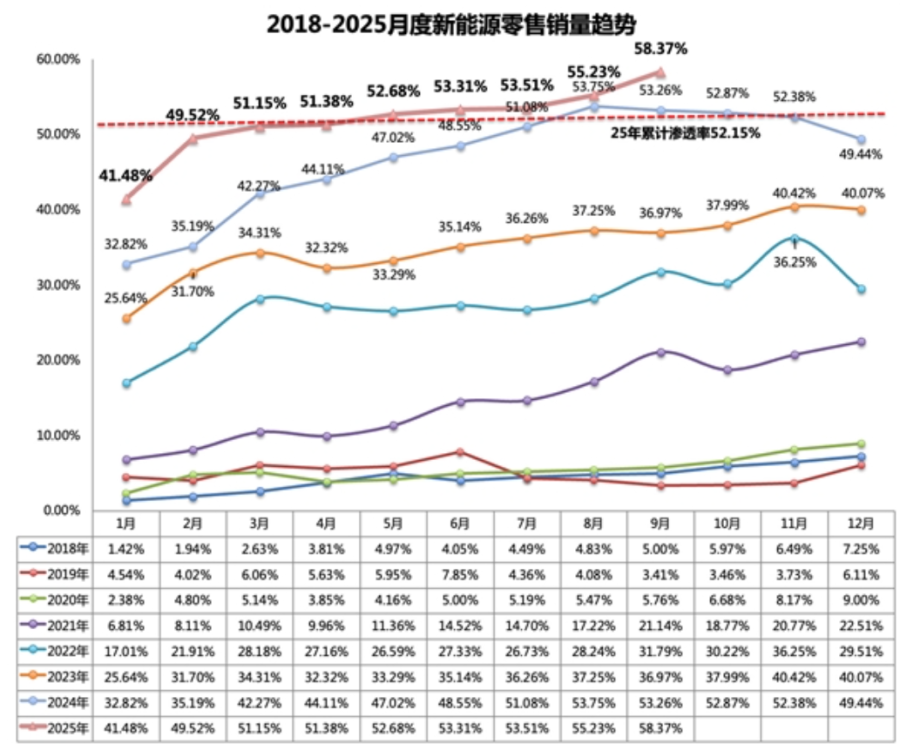 2025年更是加速攀升,1-9月累计渗透率达52.15%,9月单月直接冲刺至58.37%。