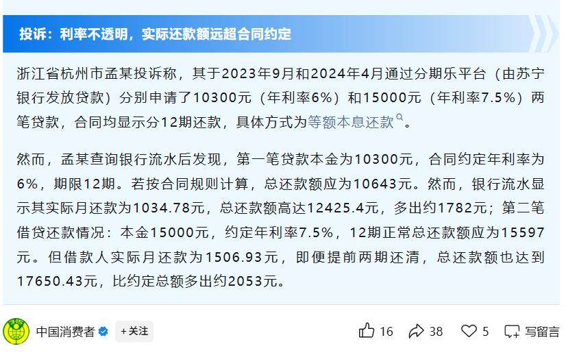 据报道,浙江省杭州市孟某投诉称,其于2023年9月和2024年4月通过分期乐平台(由苏宁银行发放贷款)分别申请了10300元(年利率6%)和15000元(年利率7.5%)两笔贷款,合同均显示分12期还款,具体方式为等额本息还款。