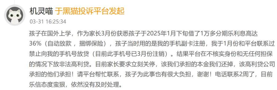 更严重的是,乐信还涉嫌违规向学生放贷。2025年3月,一位家长投诉,其孩子在国外上学期间,平台未核实身份、无担保放款1万多元,年化利率36%,并捆绑保险。2025年8月,一位大学生投诉,2021至2025年在校期间,分期乐违规放贷,收取超24%的高额利息,违反银保监会禁令。这些行为将无收入学生推向债务深渊。