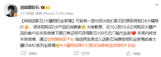 他发文称,可能有一部分因为我们影石的原因导致DJI大幅降价,为向很多刚购买DJI产品的消费者表达歉意,在10.2到10.8之间购买大疆产品的客户晒订单证明可获得影石100元无门槛代金券。