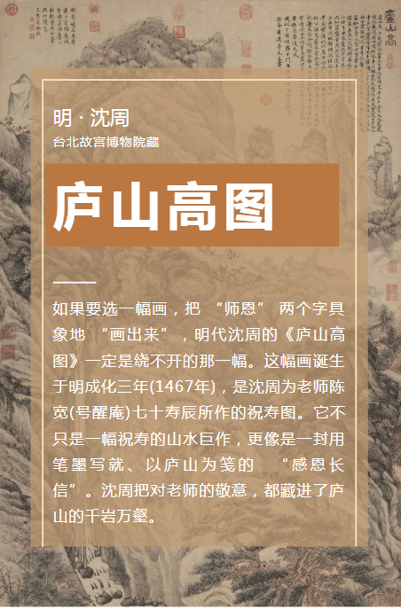 当你觉得人生步履沉重时,不妨想想《庐山高图》里的山水:山的厚重,能让你明白 “沉淀” 的力量;水的灵动,能让你懂得 “包容” 的智慧;而那溪水畔仰望的人影,会让你记起 —— 每个人都曾站在 “师恩” 的山脚下,被那份高远与温暖,默默照亮过前行的路。