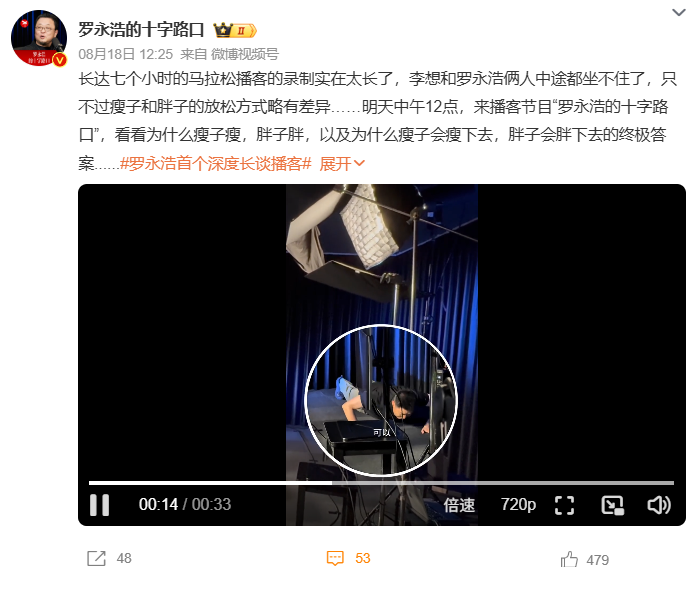 以罗永浩为例,8月18日,罗永浩个人发布微博表示,和理想创始人李想,开启了长达七个小时的“马拉松”播客的录制,甚至俩人中途都坐不住了,开始了“中场休息的运动”。