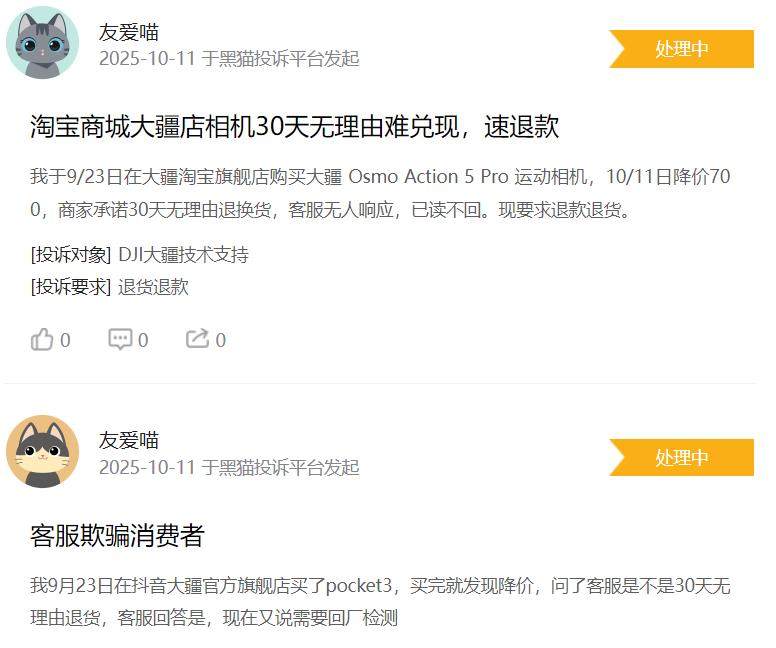 而在黑猫投诉平台上搜索“大疆 降价”关键词,截至发稿,可获取到超1600条投诉,其中有不少消费者就大疆近期突然降价且不退差价发起投诉。