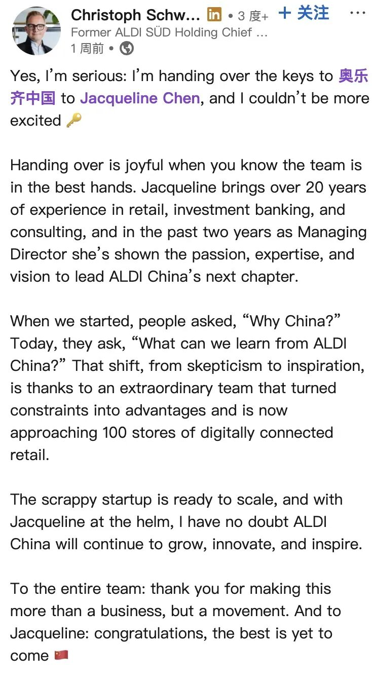 10月1日,奥乐齐ALDI中国前CEO Christoph Schwaiger在职场社交平台领英宣布,奥乐齐ALDI中国换帅,新CEO由现任奥乐齐中国董事总经理Jacqueline Chen陈佳女士担任,她将全面领导中国区业务,直接向奥乐齐全球CEO汇报。这也意味着,陈佳是奥乐齐进入中国以来的第二任CEO,亦是首位中国本土CEO。
