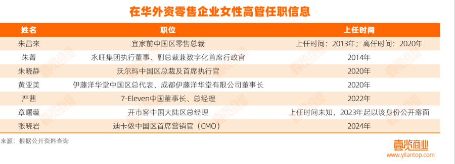 2020年以来,更多女性走上领导岗位:2020年,黄亚美出任伊藤洋华堂中国区总代表、成都伊藤洋华堂有限公司董事长,朱晓静担任沃尔玛中国总裁及首席执行官;2022年,严茜接任7-ELEVEn中国董事长;2023年,章曙蕴以开市客中国大陆区总经理身份亮相;2024年,张晓岩转投迪卡侬,担任中国区首席营销官。