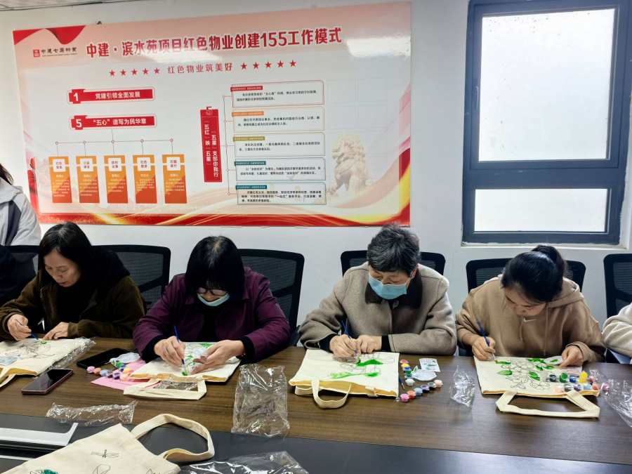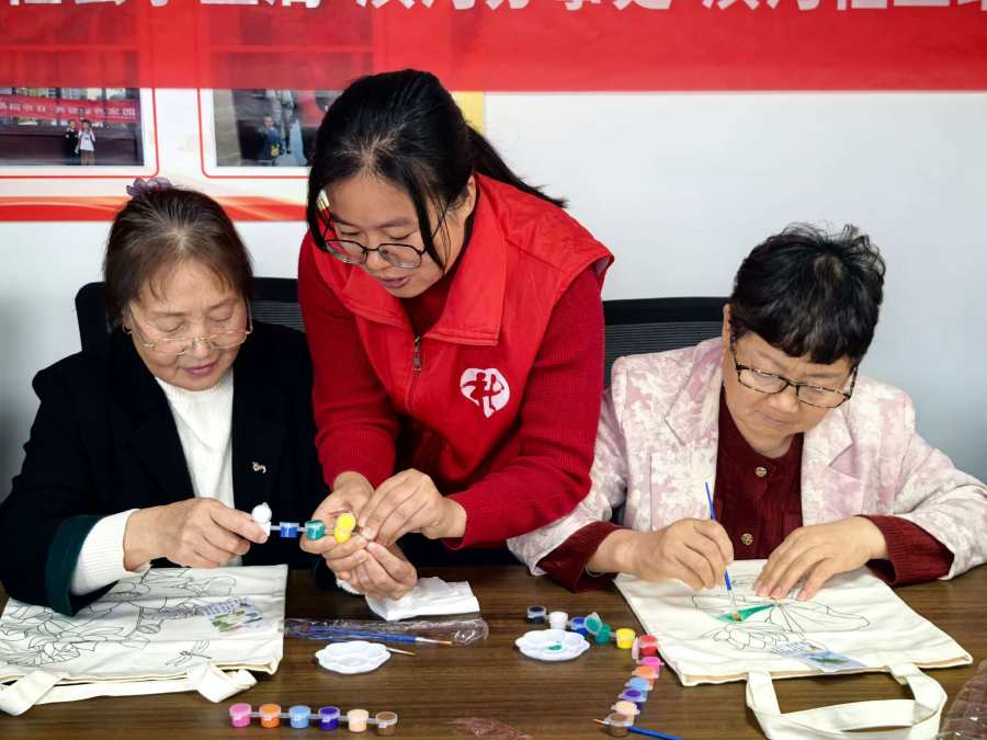 活动当天,社工提前将空白涂鸦帆布包、颜料、画笔、调色盘等材料摆放整齐。社工首先向大家介绍了活动的流程和注意事项,并耐心讲解了彩绘的基本技巧和配色知识,话音刚落,居民们便迫不及待地拿起画笔,开始构思自己的作品。居民们围坐在一起,专注地在帆布包上勾勒线条、填充色彩。有的居民对照模板认真描摹,淡雅的兰花、粉嫩的桃花在帆布包上渐渐舒展;有的居民则结合自身经验稍作创新,给荷花添上几片露珠,让画面更显灵动;还有的居民们互相交流着绘画心得,不时探讨配色技巧,欢声笑语不断。经过大家的精心创作,一个个原本素净的帆布包变成了色彩斑斓、充满个性的艺术品。居民们纷纷拿着自己的作品拍照留念,脸上洋溢着成就感和幸福感。“看我画的荷花多鲜艳,以后买菜逛街就能背,实用又好看。”家住3号楼的张阿姨举着自己的作品,笑得合不拢嘴。