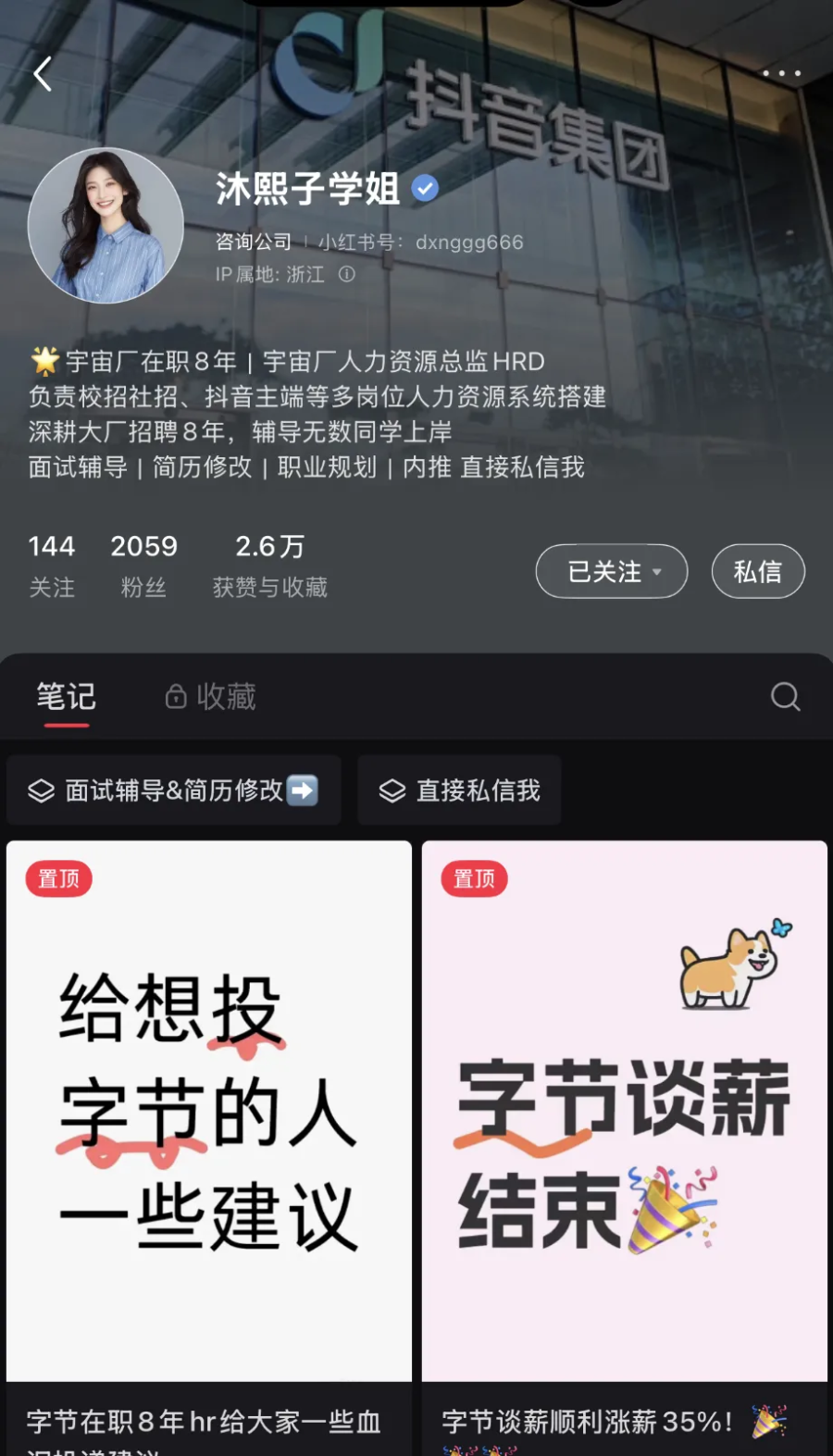 根据受访者提供的资料,该导师在社交平台上的用户名为“字节hr熙熙”,个人简介中罗列着诸多光鲜标签:人力资源总监、字节跳动资深人资、八年终面面试官经验、帮助超500人上岸,并负责抖音端多个核心岗位的招聘。
