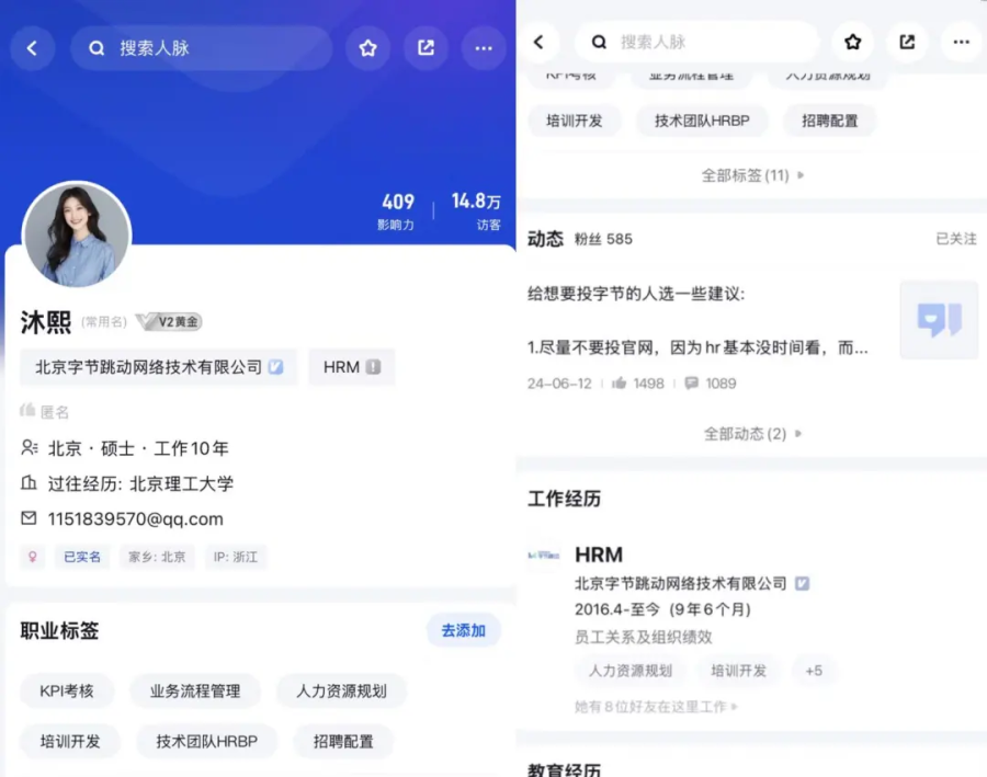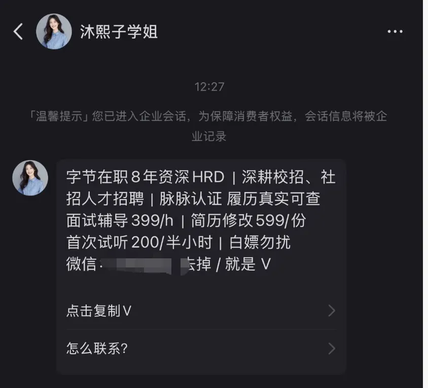然而,这些身份标签均系伪造。所谓的“字节资深HR”身份实为假冒,其宣传内容与事实严重不符。