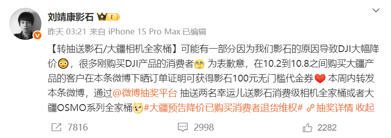 他宣布为10月2日至10月8日期间购买大疆产品的消费者,提供100元无门槛代金券,用户晒订单即可领取;同时发起转发抽奖,奖品包括影石消费级相机全家桶或大疆OSMO系列全家桶。