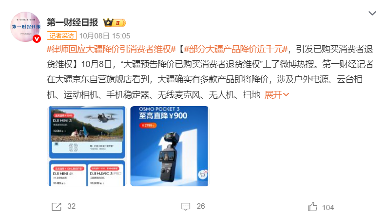 一些降价前购买产品的消费者则感到被“背刺”。不少网友称,其赶在国庆黄金周期间及之前购买了大疆的产品,而国庆假期还没过完,刚买不久的产品就便宜了近千元。