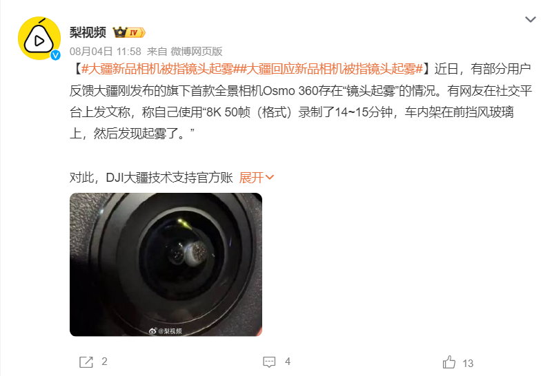 然而,部分消费者在使用Osmo 360时反映出现“镜头起雾”现象。对此,DJI大疆技术支持官方账号回应称,设备在出厂前经过严格的起雾测试,但若用户在潮湿环境中打开电池仓更换电池,可能会因空气湿度过高而导致雾气凝结。大疆强调,Osmo 360具备防雾设计,只需以高规格模式录制15至20分钟,待机身升温后湿气即可散出,正常使用时不会再起雾。