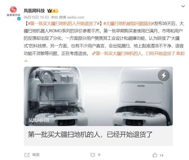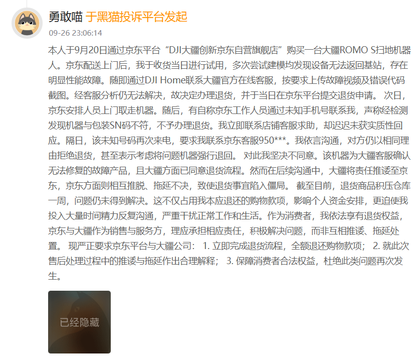 “趣解商业”注意到,黑猫投诉平台上,有消费者投诉称,在“DJI大疆创新京东自营旗舰店”购买一台大疆ROMO S扫地机器人。收货当日试用时,多次尝试建模均发现设备无法返回基站,存在明显性能故障。