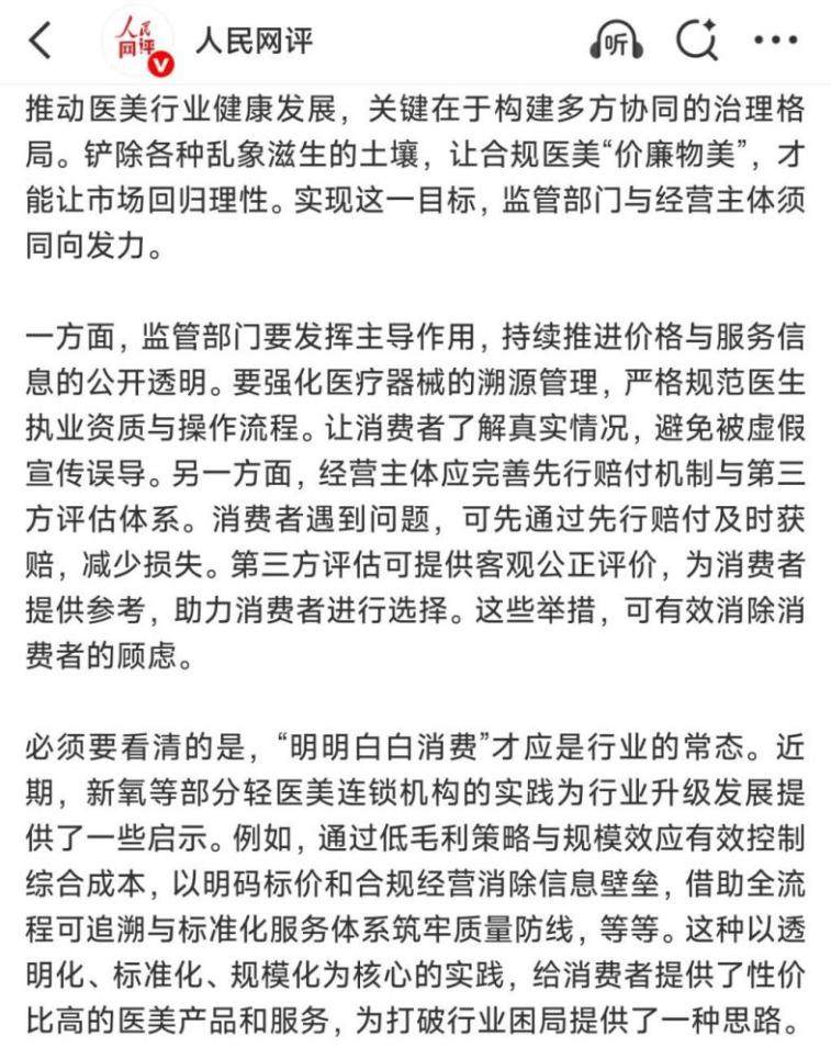 10月11日,人民网评称,推动医美行业回归理性,要持续推进价格与服务信息的公开透明,如新氧等轻医美机构通过低毛利、规模效应、明码标价、合规经营、全流程可追溯和标准化服务,以透明化、标准化、规模化路径,提供高性价比产品与服务,为打破行业困局提供了新思路。