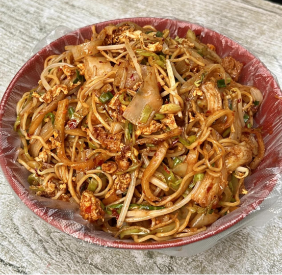 “炒八掺”没有固定配方,全凭食材灵活搭配——凉皮、米皮、牛筋面、热干面、炒饼等主食任选,再加入面筋、豆芽、包菜等配菜,大火猛炒间,香气瞬间迸发。12元一份的定价本就实在,老板还特意说:“周末自动降1块,让打工人也吃得起。”