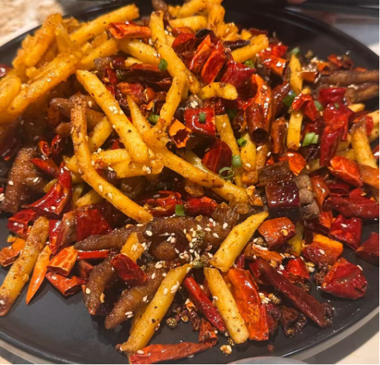 除了老味道,丰产路也藏着不少新派馆子,为这条老街添了几分“青春气息”。因味疆来新疆小馆(红专路店),店面环境透着西北风情,一进门就闻到孜然的香气。酥皮烤包子外皮烤得金黄焦脆,沙湾大盘鸡分量扎实,鸡肉嫩而不柴,还有新疆手抓饭、红柳大串、特色油包肝、自制酸奶......一口就穿越到天山脚下。